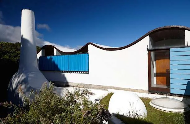 Architect Gabriel Fagan designed his own home, called Die Es, in Cape Town as a personal statement. The undulating roof shape "conforms directly to the plan by enhancing the cell-like separateness of each room, while lifting to frame alternate western sea and eastern mountain views." Fagan is a national icon in South Africa famous for "championing the traditional architecture of Cape Town" and for celebrating the town's culture with his building designs.